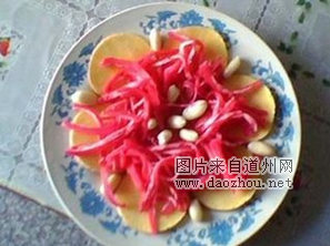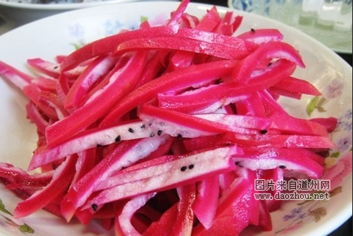 凉菜把火龙果皮剥下来,切成丝放到盘子里,加入少许香油,再放入适量的盐、鸡精搅拌即可。