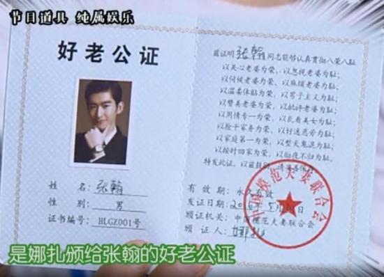 不过节目组也为这个证件打上说明:节目道具,纯属娱乐。一旁的娜扎看到这个证件,本来一直严肃认真,立马露出了灿然的笑容,还略有害羞的转过脸。可真是虐狗指数爆棚。包贝尔更在节目里开玩笑说:我赌上这一对的婚姻幸福!(证明我说的是真话)