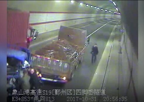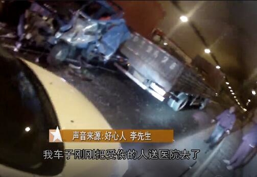 监控录像显示,当天晚上20点52分左右,一辆蓝色货车缓缓地停在隧道内,随后就被后面来车追尾,三辆货车碰撞在一起。一辆蓝色的小货车被挤压在两辆货车之间,受损严重,位于驾驶室的两人都被卡在里面不能动弹。驾驶员受伤严重,腿部都是鲜血。