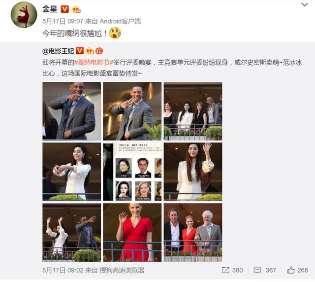今年范冰冰受邀担当戛纳电影节的评委,金星转发微博,配文:今年戛纳很尴尬。