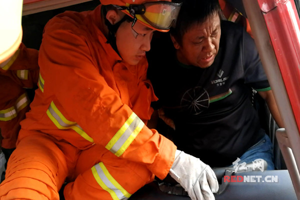 10月27日6时18分,零陵消防大队接到119指挥中心调度,称泉南高速永州服务区962公里处发生一起两车追尾事故,事故导致一名驾驶员被困。零陵消防官兵到达事故现场后发现,现场一片狼藉,到处都是散落的汽车零部件。两辆大货车紧紧地“吻”在一起。挡风玻璃散落一地,驾驶前台和驾驶室车门受挤压严重变形内陷,被困驾驶员被死死地困在驾驶座位上。经问询了解,驾驶员神志清醒。从现场了解的情况来看,驾驶员只是双腿部位卡住,身体其他部位完好。