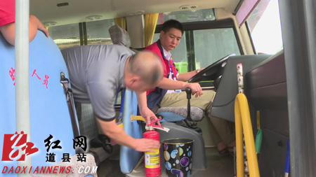 道县校车办负责人检查校车灭火器。