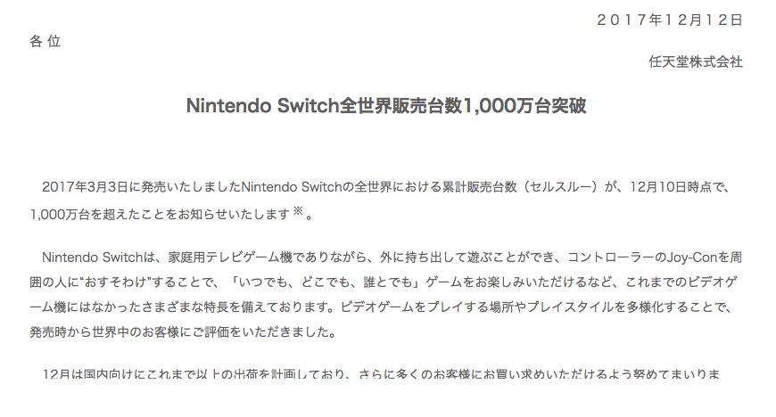 近日,任天堂正式宣布 Switch 的销量突破了 1000 万台,而它的销售时间只有 9 个月。任天堂此前推出的游戏主机 Wii U 五年内也才卖出 1300 万台。另外需要说明的是,Switch 一经发售,便引起了玩家的抢购,长期处于供不应求的状态,日本等市场甚至使用摇号的方式销售。Switch 的产能问题很大程度上限制了销量的进一步增长。