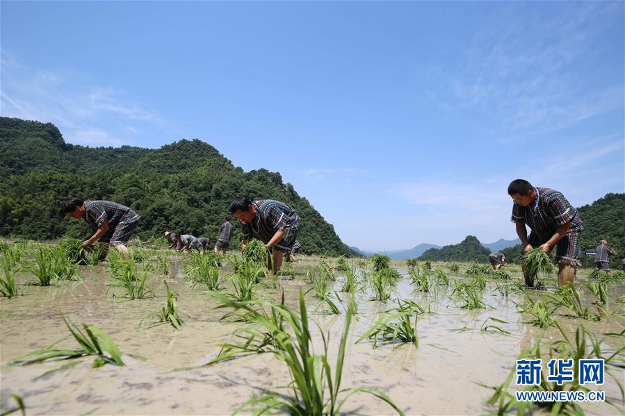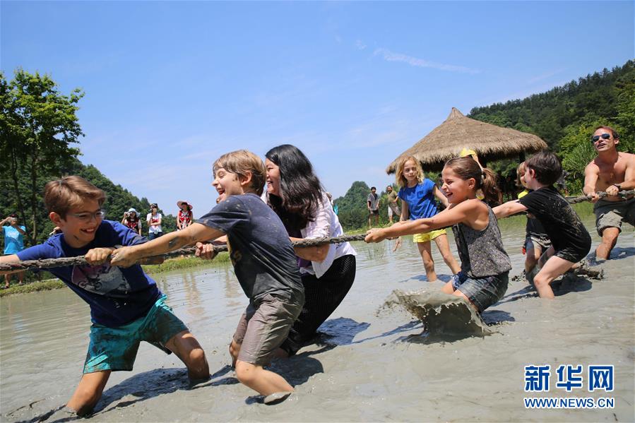 27日,在湖南张家界市武陵源区中湖乡五号山谷旅游度假民居,中外游客和当地村民一道在稻田里插秧苗,在泥地里拔河、摸鱼,感受当地端午节民俗文化,体验乡村旅游农耕乐趣。