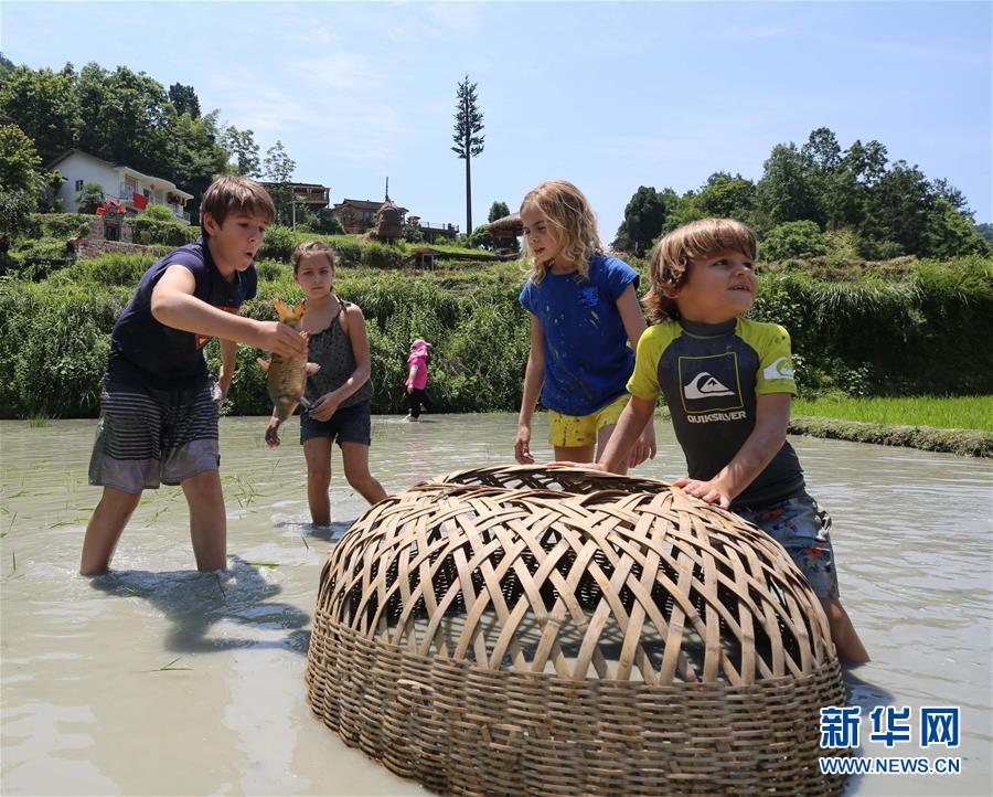 5月27日,几名外国小朋友在稻田里体验摸鱼的乐趣。