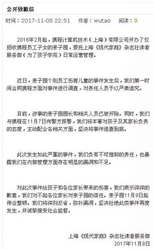 与此同时,携程亲子园委托方上海《现代家庭》杂志社读者服务部也发布公开致歉信,称目前涉事亲子园园长和相关人员已经被开除,并将积极配合警方,将事件追查到底。(周小白)