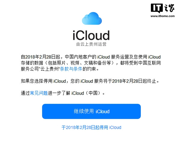 1月13日消息 2018年2月28日起,中国内地的iCloud服务将转由云上贵州大数据产业发展有限公司负责运营,根据苹果此前公布的消息,此次影响的用户是将Apple ID位置设定为中国的用户,但苹果的一个失误举动让不少美区用户也吓得不轻。