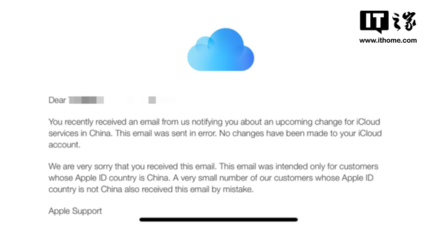 部分美区用户发现,自己绑定Apple ID的邮箱中出现了苹果提示iCloud数据即将转移的邮件,苹果在今天表示,只有部分用户收到了这封邮件。并向这些误发的用户重新发送邮件解释称这是失误,只有将Apple ID国家设置为中国的用户才会将其iCloud数据迁移到云上贵州服务器。