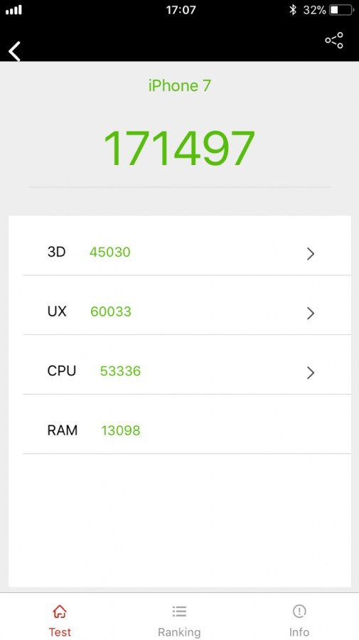 再来是iPhone 7,通过安兔兔跑分发现,处于iOS 11.1.2版本的跑分165180,而在升级iOS 11.2.2之后,iPhone 7的跑分上升到了171497。在大部分设备修复两大漏洞之后,性能出现不同幅度下降之时,iPhone 7的跑分出现了“逆势”上涨。