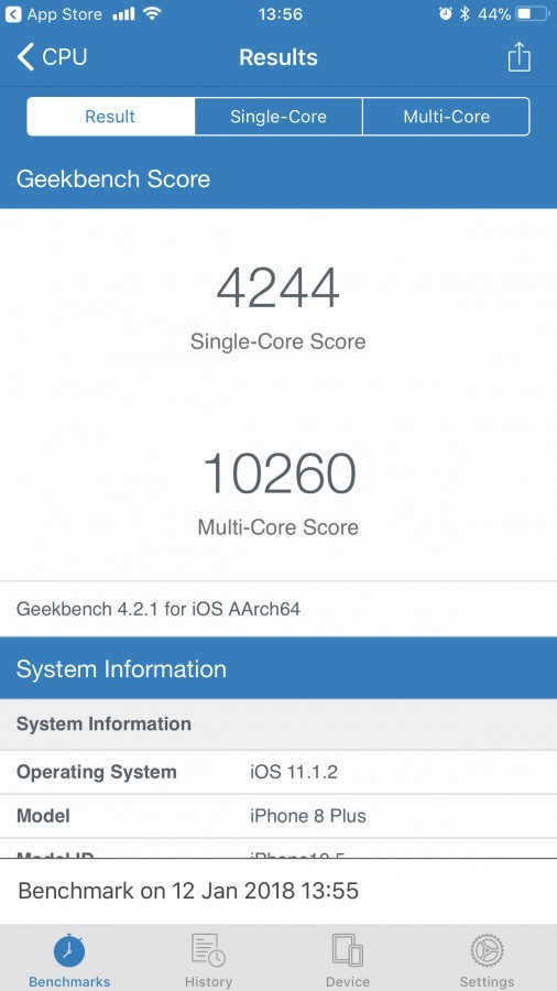 首先是iPhone 8 Plus,在GeekBench跑分中,处于iOS 11.1.2版本的单核得分为4244,多核得分10260;升级到11.2.2之后,单核得分4225,多核得分10219。