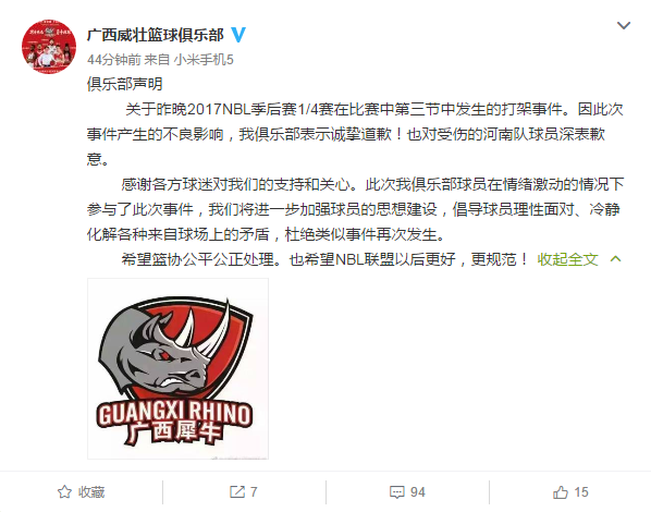 关于昨晚2017NBL季后赛1/4赛在比赛中第三节中发生的打架事件。因此次事件产生的不良影响,我俱乐部表示诚挚道歉!也对受伤的河南队球员深表歉意。