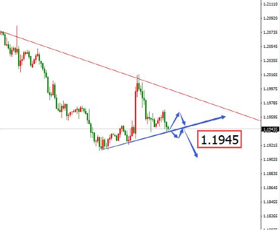 昨天,欧美下跌后反弹,回踩下降趋势线压力位,承压拐头向下。当前价格运行在承压回落过程中,空方向下发力。关注价格能否在低点连线上方受到支撑,或选择跌破,等待价格选择明确方向。操作策略:如果价格跌破低点连线支撑位,在1.1945一带,等待回踩确认承压,出现做空信号,建议找位置进空为主。关键位置 上方 1.1965 下方 1.1945