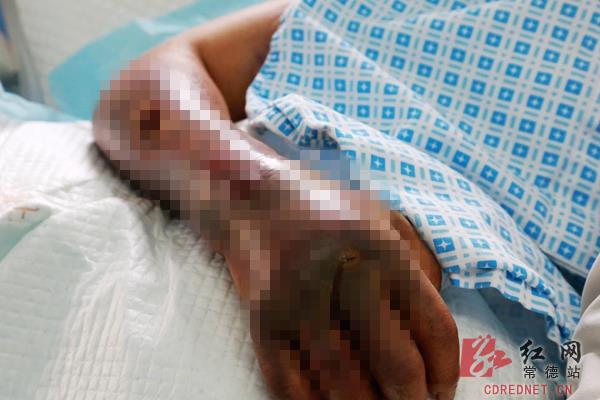 该农妇姓张,63岁,石门县三圣乡人。6日晚,她像往常一样去自家猪栏抓稻草,“刚把稻草抱起来,感觉右手背一阵剧痛。”张老太生前对医生回忆道,当时只见右手背上一条细小伤口,她并未放在心上,自行随意处理了一下。“慢慢地,伤口开始发黑,并有扩散的趋势。”两日之后,张老太整条右臂都呈现黑紫色,还伴有肿胀、破溃。“不时感觉头晕、胸闷、腹痛。”
