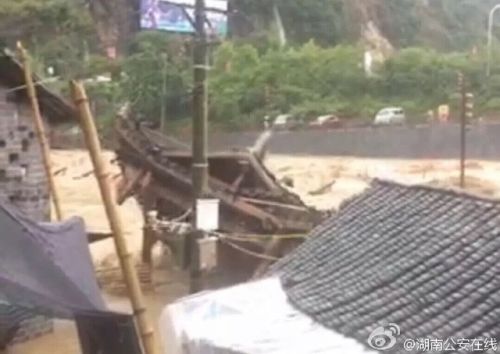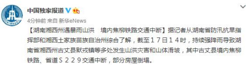 中国独家报道微博信息,从湖南省防汛抗旱指挥部和湘西土家族苗族自治州综合了解,截至17日14时,持续强降雨导致湖南省湘西州古丈县默戎镇等多处发生山洪灾害和山体滑坡,其中古丈县境内焦柳铁路、省道S229交通中断,部分房屋倒塌。()