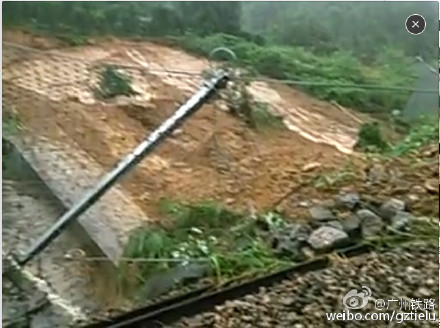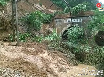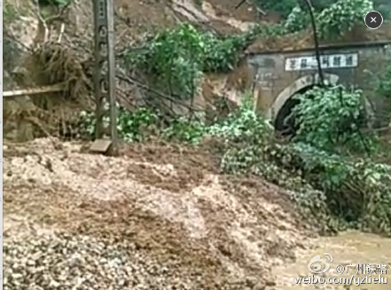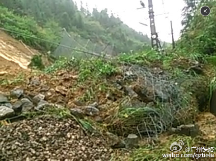 7月17日11时31分,焦柳线湘西古丈县万岩至龙鼻嘴间,因暴雨导致山体溜坍,掩埋线路,影响列车通行。现铁路部门正组织力量紧急抢险,同时采取临时封锁线路区间、组织部分列车迂回、折返、停运等方法,眷调整和恢复列车运行秩序。具体晚点和迂回运行的列车车次将后续发布。为不影响您的出行,请及时关注广州铁路和12306网站、车站列车公告。自然灾害造成列车晚点,敬请旅客谅解。图溜坍现场