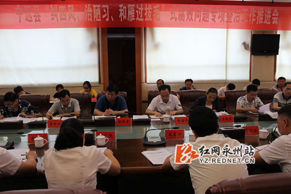 8月10日讯( 唐振军 刘佳宾)8月8日上午,湖南省宁远县在政务中心203会议室组织召开“雁过拔毛”式腐败问题和“纠四风、治陋习”专项整治工作推进会,全面总结上半年专项整治工作情况,安排部署下段整治工作开展。会议由县委常委、县纪委书记陈海平主持。县纪委监察局班子成员及部室负责人、乡镇(街道)纪(工)委书记、部分县直单位纪检组长(纪委书记)参加会议。