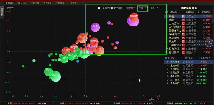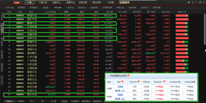 概念方向上在绿框内的所有概念都是10日内资金流入较多,而概念涨幅还是不错的类型,比如说:“机器人概念、有机硅概念、病毒防治概念”等大量即将启动的概念,只需要选择其中的符合条件进行买入即可。