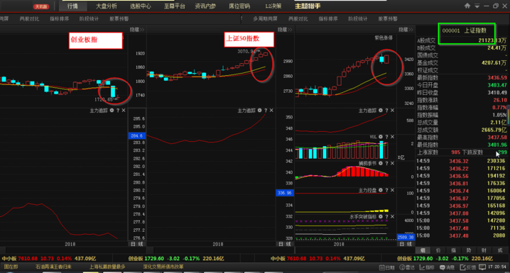 分析各大指数走势,上证指数在昨日的策略当中明确分析了短周期30分钟和60分钟智能辅助线的支撑位3400点的位置就是支撑位,只要这个位置能够支撑住,沪指势必在日线角度上形成强势高位震荡格局,并且在上证50指数强势逼空式上涨的推动之下沪指高位震荡在所难免,而今日恰好给出了阳包阴的K线形态,正好说明柯宇川的分析方向是对的,现在对于沪指来说,就差捕捞季节止跌信号形成,若该信号形成将会产生共振效应,上涨才能算是正式确立。而对于创业板来说则是风险,所以“二八分化”的行情再次上演的淋漓尽致,机会存在哪儿显而易见了。