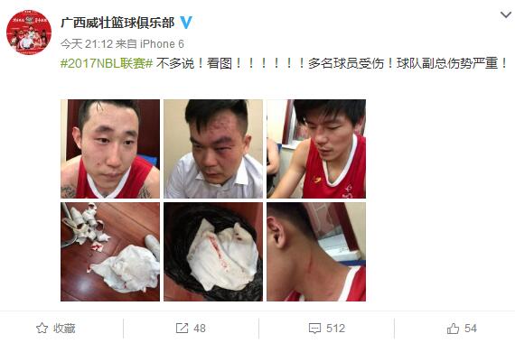 广西队赛后连发多条微博和照片,照片中球员受伤了,而副总左眼明显肿了,额头左侧血印斑斑。“现场保安在哪里?”广西队写道,“多名球员受伤!球队副总伤势严重!”