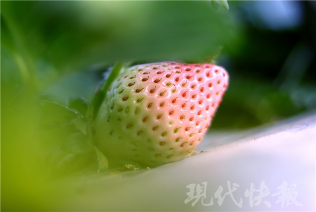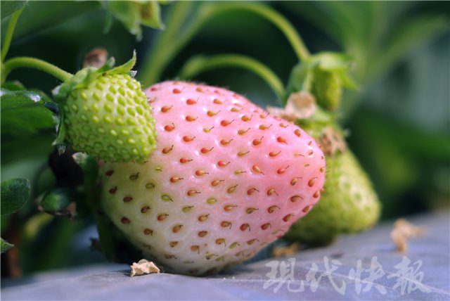 一般的草莓成熟之后是红色的,而在纪荣喜的草莓大棚里,一种叫做"白雪公主"的草莓颜值与普通草莓不一样,它成熟之后呈现白色或淡粉色。经过去年引进试种成功之后,纪荣喜今年开始种植"白雪公主",目前已经有零星草莓成熟,不过产量极其少,想"尝鲜"还是不太容易。