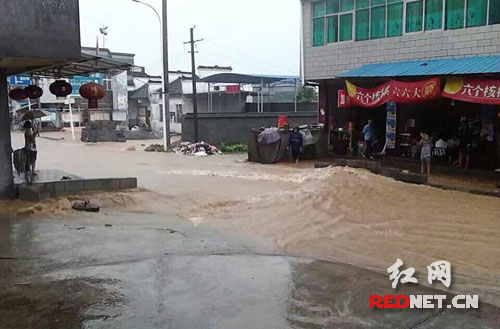 暴雨引发的洪水在永顺沙坝镇街道上奔腾。 贺志智 摄影