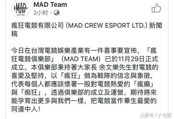今日在台湾电竞娱乐产业有一件喜事要宣布,「疯狂电竞俱乐部」(MAD TEAM)已于11月29日正式成立,本俱乐部秉持着大家长 余文乐先生对电竞的喜爱及坚持,以「疯狂」做为战队的信念与象征,代表每个人都应该怀着一股对电竞热爱的「疯癫」与「痴狂」,透过俱乐部的成立及运营,期待将来能孕育出更多与我们一样,把电竞当作毕生最爱的同道中人!