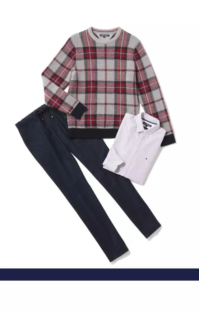Tommy条纹毛衣搭配美式休闲风衬衫是不变的美式经典。