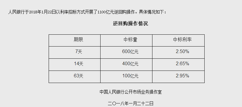 央行公告,于1月22日以利率招标方式开展了1100亿元逆回购操作,其中7天期600亿元,14天期400亿元,63天期100亿元。具体情况如下: