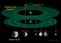 地球都“脱单”了:NASA发现地球2.0 相似度0.98(图 日期:2015-07-25 03:15:58 Kepler-452和地球的对比图,Kepler-452b的体积是地球的1.6倍。 图为开普勒望远镜之前发现的kepler-186星系与kepler-452b所在的星系和太阳系比较。 Kepler-186系统的恒星因为比太阳小很多,所以它的主要行星几乎都很靠近恒星,大约和我们太阳系的水星轨道相当...