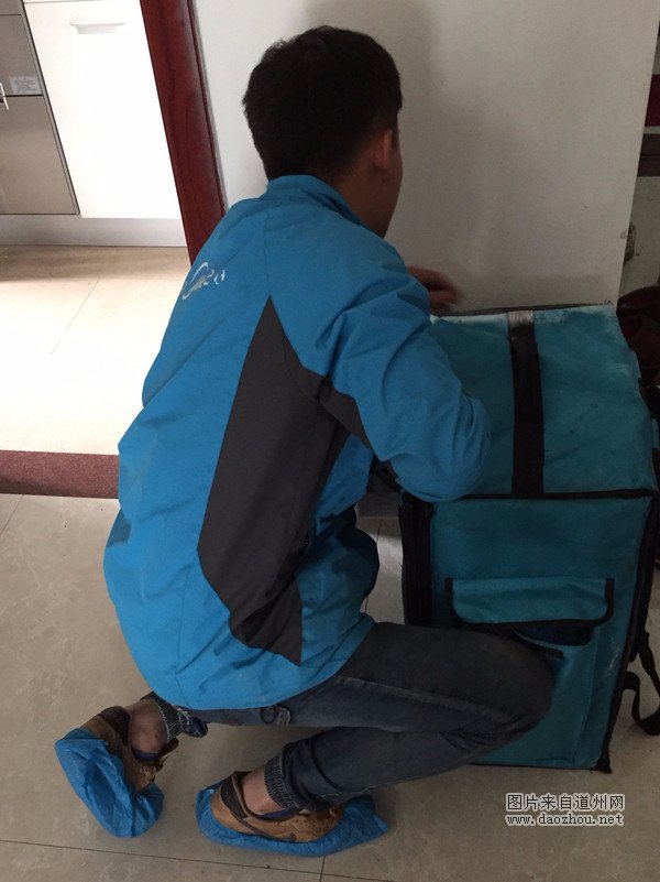 在门外穿上鞋套后才背着工具进入室内。