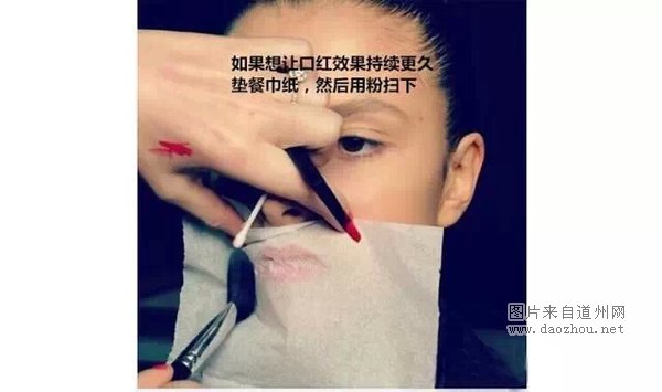如果想让口红效果持续更久,在画完的唇妆上垫上薄薄的纸巾,然后用定妆散粉扫一层就OK了。