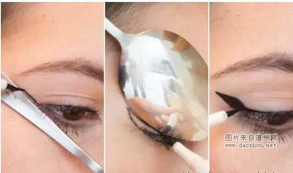 利用勺子弧度在眼皮上方当参照线,用眼线笔顺着勺子弧度勾勒即可。