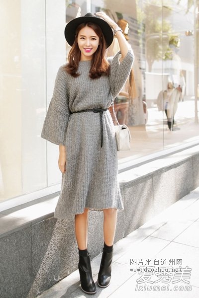宽袖裁剪的毛衣长裙,气质灰色百搭有型,宽松版型系上黑色小腰带勾勒出曼妙身姿,时髦有韵味,搭配黑色高跟短靴,戴上宽檐帽,女人味。