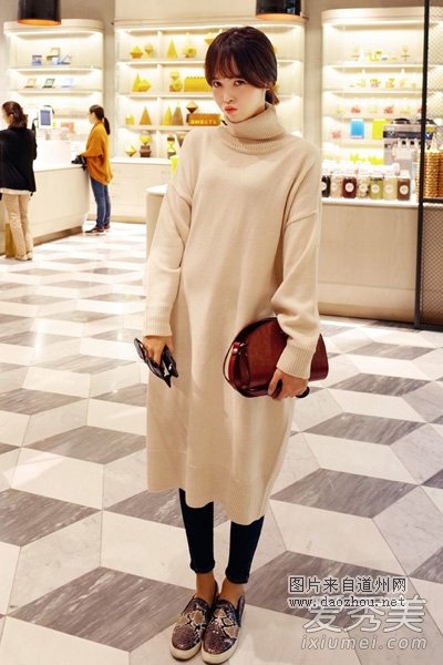 休闲款式的高领长裙,精致的宽松版型百搭时髦,相信很多女生都会爱这款裙子,搭配小脚裤和球鞋,韩范儿十足的装扮。