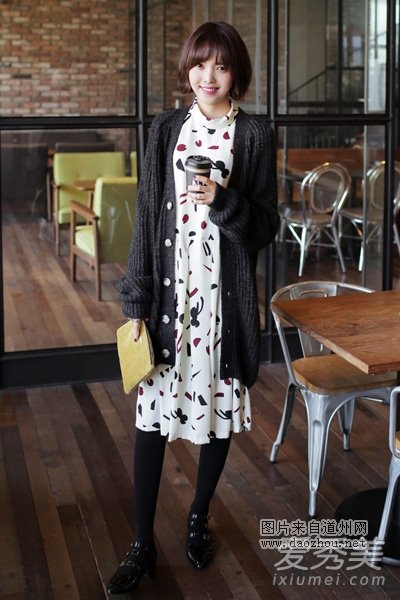 印花图案装饰的长袖长裙,搭配深灰色长款毛衣外套,是不是很有小清新范儿呢,这身装扮是春季最流行风格,不过这款裙子完全可以混搭套头毛衣和长款大衣穿,会更优雅的。
