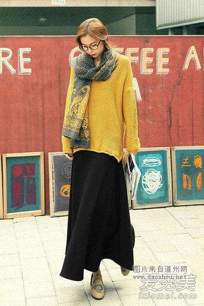 姜黄色宽松毛衣搭配黑色半身长裙,系上民族风围巾,如此复古文艺范儿装扮,让人眼前一亮,穿在身上清新雅致,尽显恬静素雅的味道。