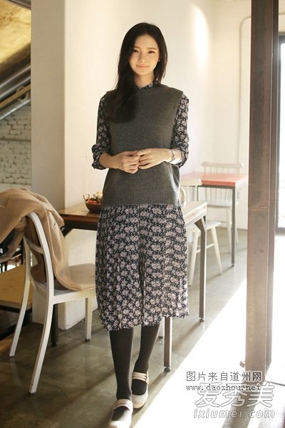 碎花长袖长裙,田园风格的裙装,穿在身上透着温柔淑女的气质,带点小 清新风格,给人的感觉很舒服,搭配深灰色毛衣,穿上裤袜和厚底鞋,一 款呢子大衣就能搞定冬季搭配。