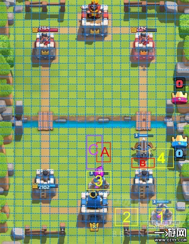 b.对手近程兵种。例如王子、皮卡超人进攻你的右路。你除了可以在起过河后,在上图C处放置建筑外,还可以在上图A处放置骷髅兵,哥布林等低费单位进行引诱。