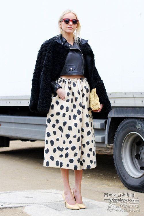 黑色外套有点沉闷,内搭短款皮衣和高腰波点半裙,花苞裙裾优雅复古,打造高挑迷人的身姿,清新的浅黄色高跟鞋,平衡了外套的沉闷。