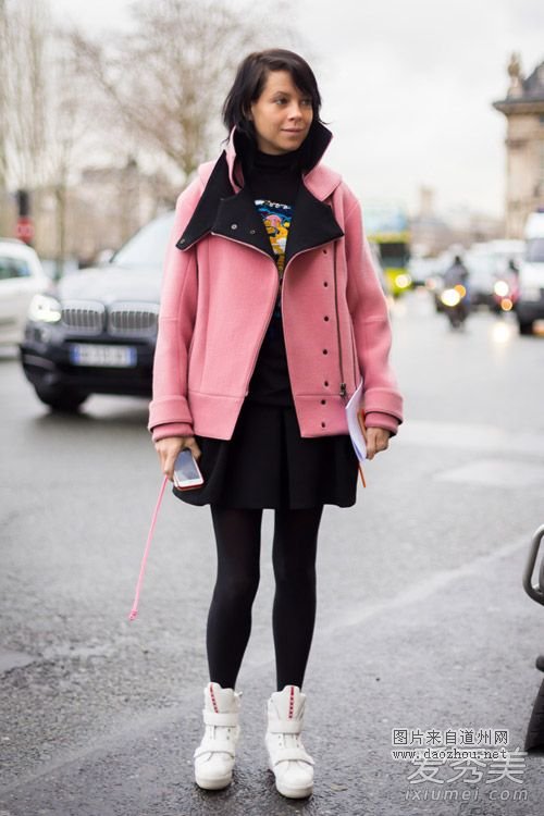 粉色外套甜美可爱,减龄十足,搭配黑色卡通卫衣裙,又一个甜美减龄的look。