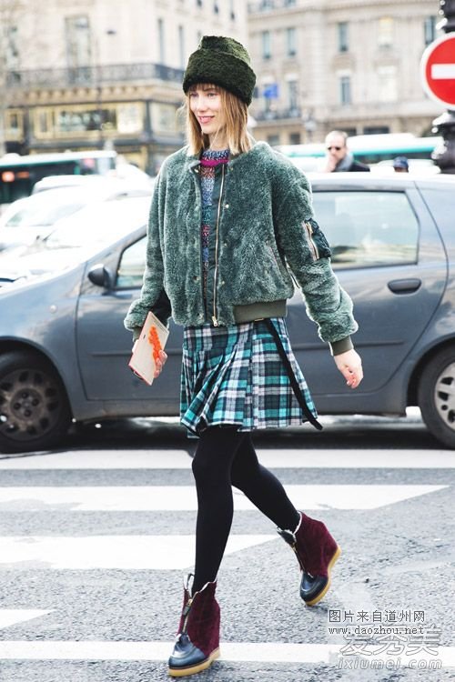 绿色毛绒外套休闲的短款设计,减龄清新,搭配印花上衣和绿色格子短裙,既时髦又很有活力。