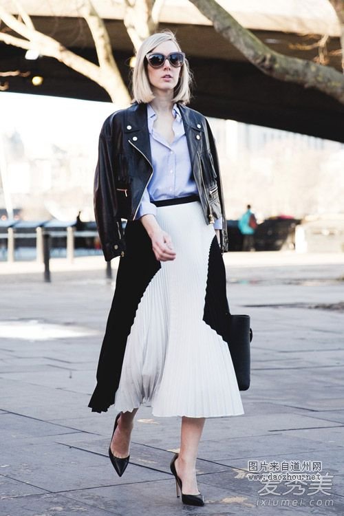 黑色皮夹克是春季的主打外套之一,搭配浅蓝衬衫和黑白拼接设计的百褶裙,气质知性,风格飘逸,让人过目不忘。