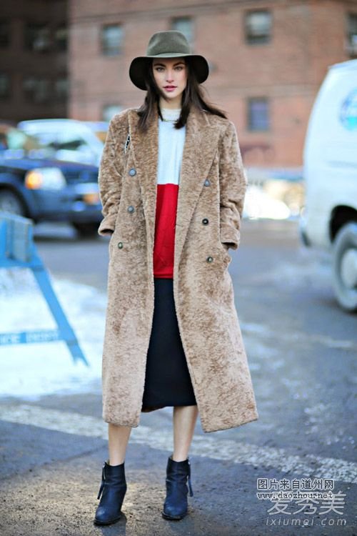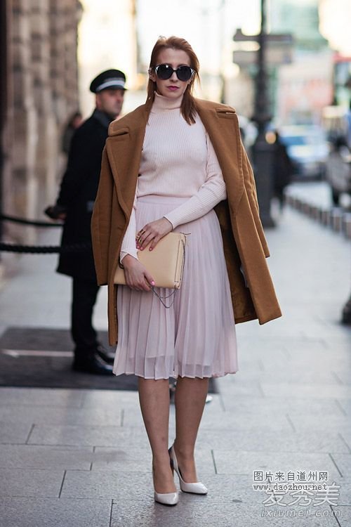 驼色大衣配浅粉色高领毛衣和粉色雪纺裙,淡淡的色彩真是极致柔美,优雅而富有女人味。