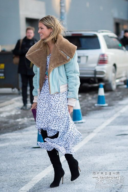 浅蓝色羊羔绒外套搭配浪漫飘逸的碎花雪纺裙,暖暖的造型,小清新的颜色,让人心旷神怡。