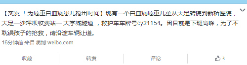2月15日18时26分讯(阙影)今(15)日下午18时20分许,从重庆市公安局得到消息,警方接到大足一儿童家长发来的求助信息,因孩子患白血病,目前情况危急,正乘坐救护车(车牌号为CY21154)从大足赶往市儿童医院抢救。